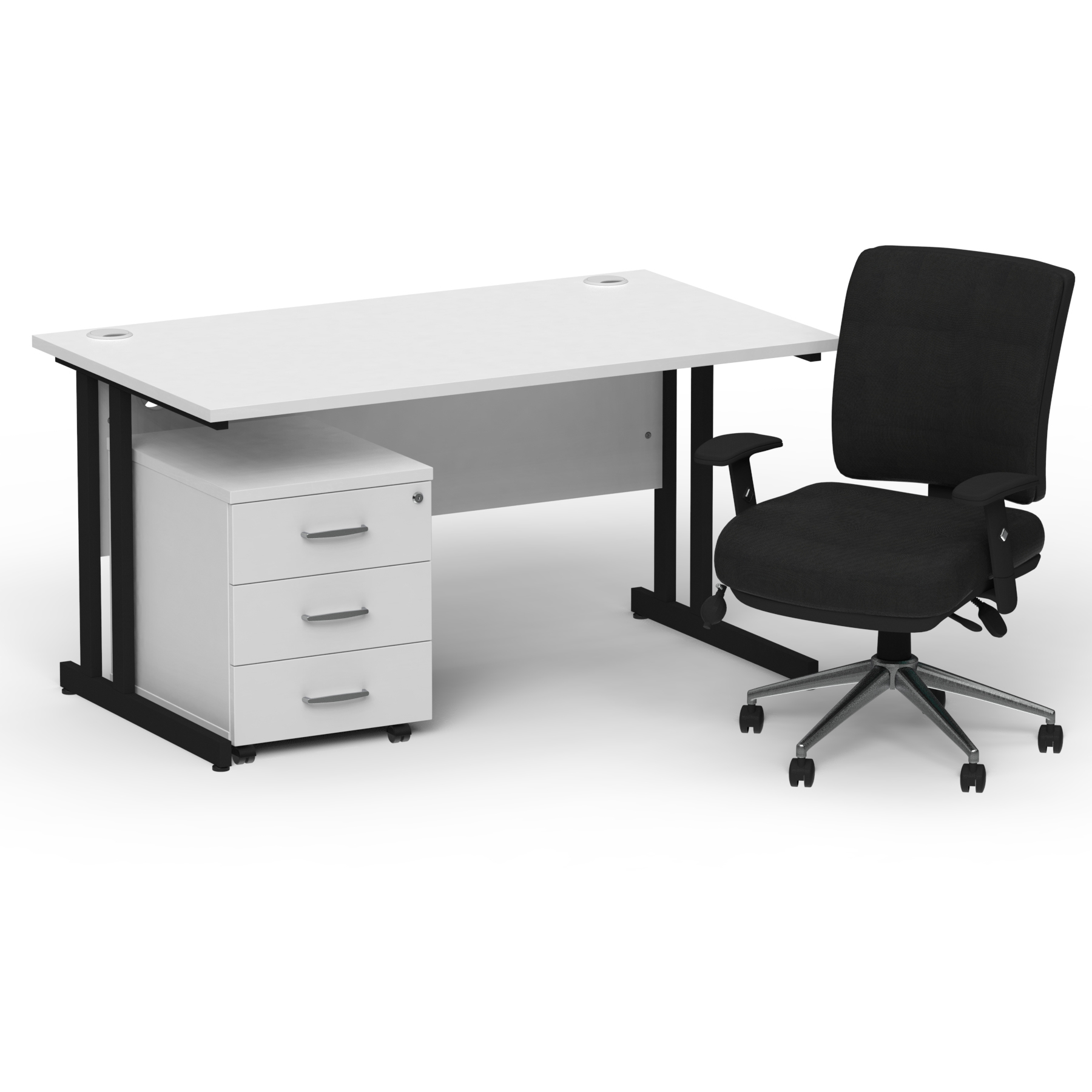 Impulse contract desk | 25mm tops | Heat resistant melamine finish | 18mm modesty panel | Double strut legs | Steel to steel fixings | Impulse mobile pedestal | Steel handles | Smooth running castors for mobility | Lockable drawers | Solid drawer construction | Chiro medium chair | Posture chair UK Chiropractic Doctor approved | Height adjustable back and seat | Pump lumbar support | Triple lever independent mechanism | Independent seat and backrest tilt angle adjustment | Gas lift tested up to 150kg | Usage: Task 24/7