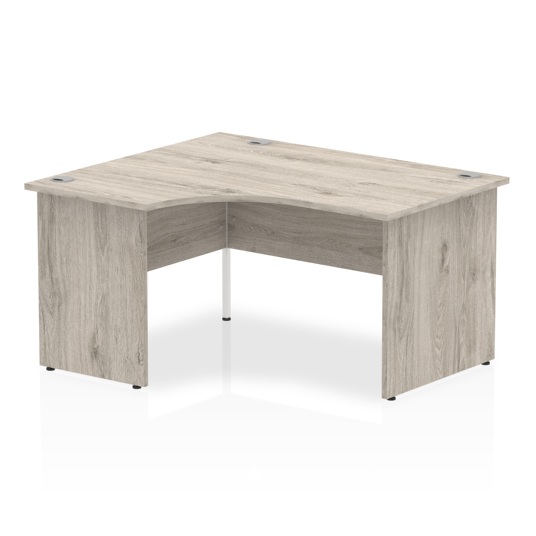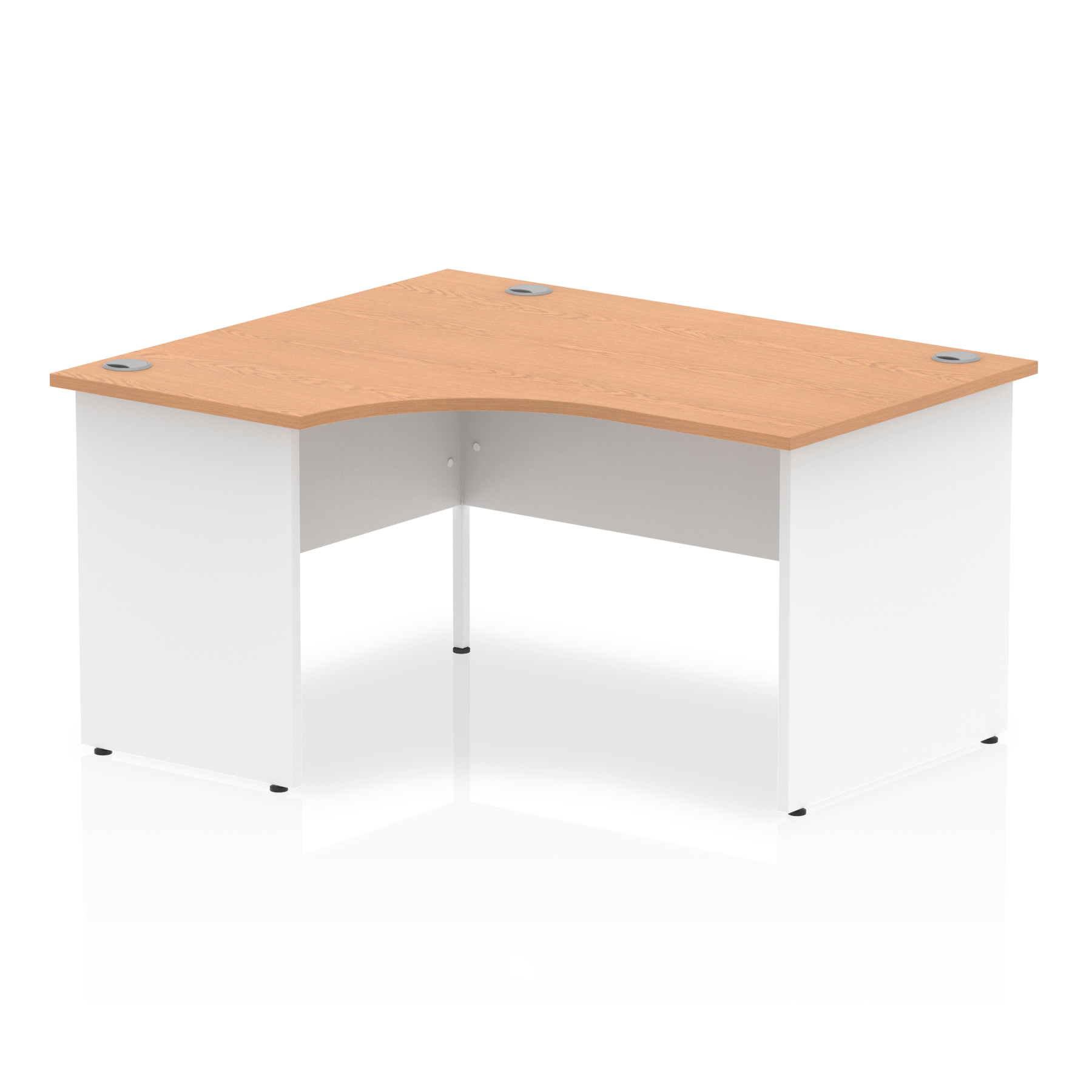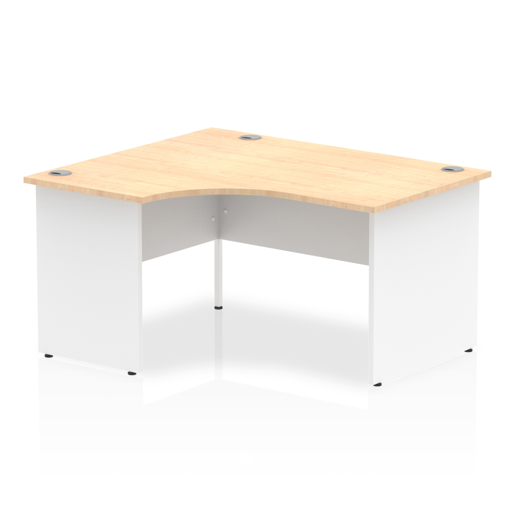 Impulse contract 1400 wide crescent desk | 25mm tops | Heat resistant beech melamine finish | 18mm modesty panel | 2mm protective abs edging | Matching wood panel end legs | 3 cable ports | Height adjustable feet | Steel to steel fixings | 3 modesty panel slots | 600 deep | Deep set modesty panel (5″) allows for compatibility of most screen clamp fittings | Weight Capacity 135Kg