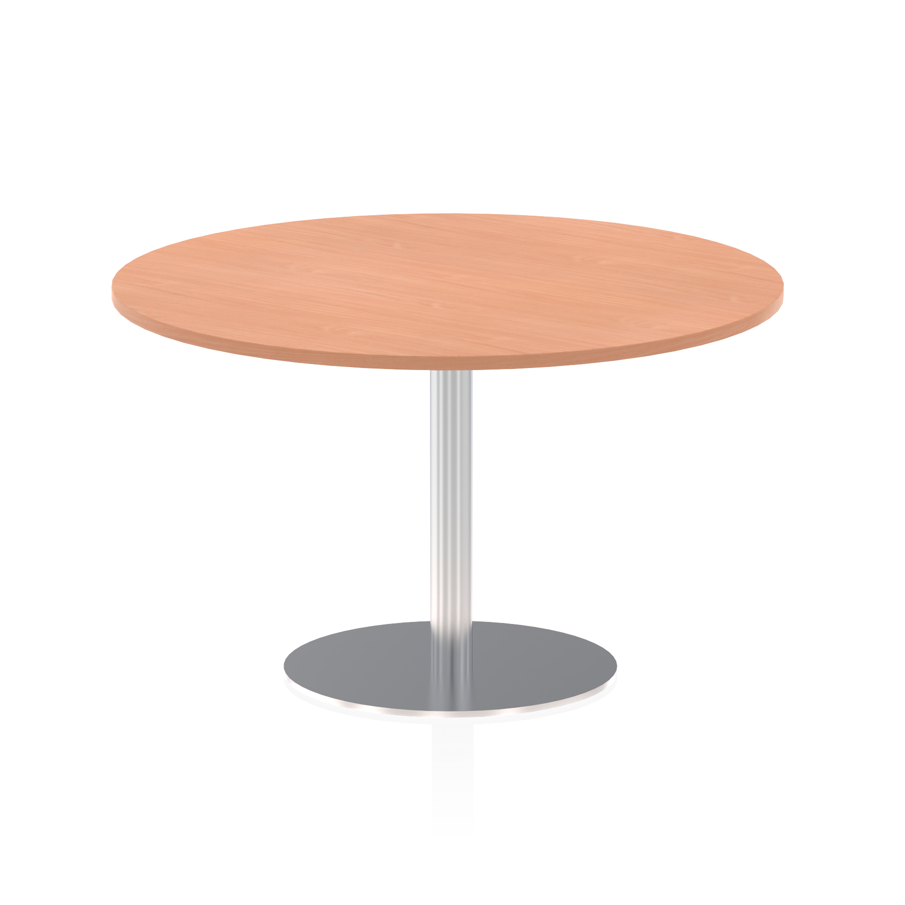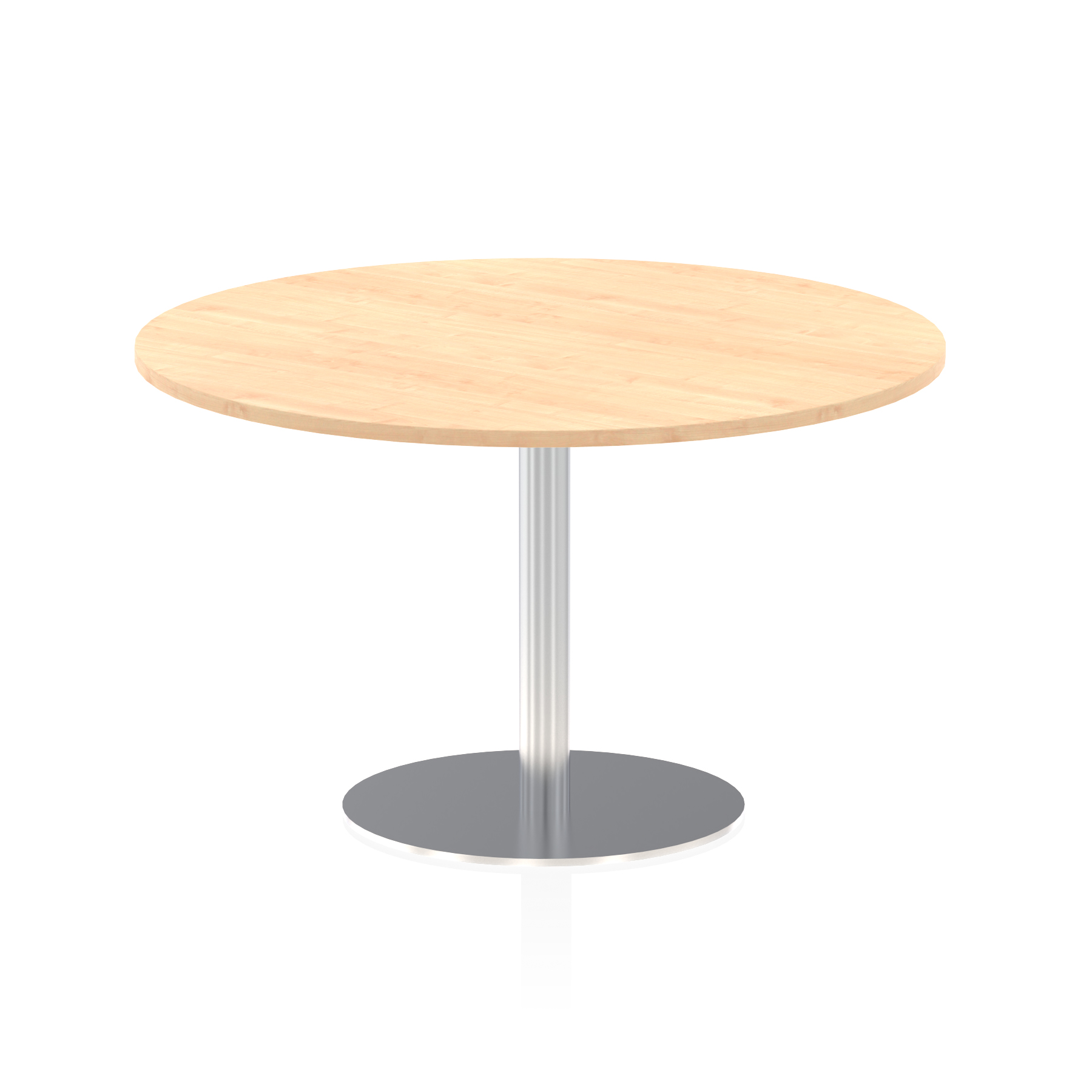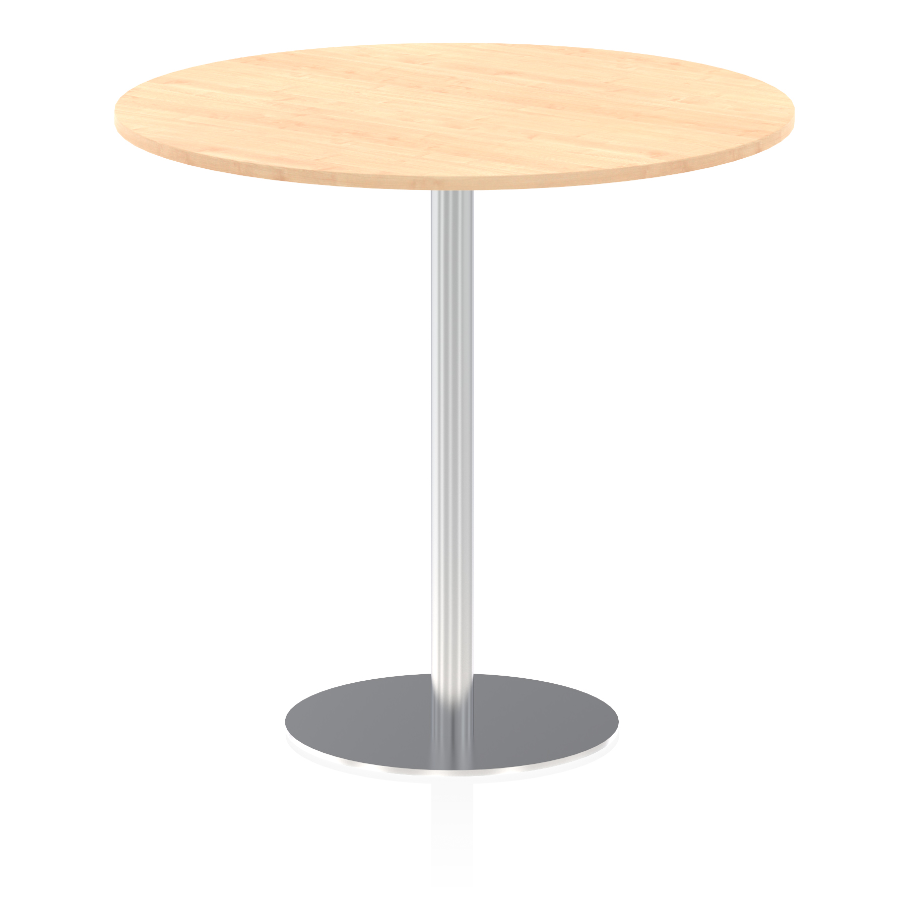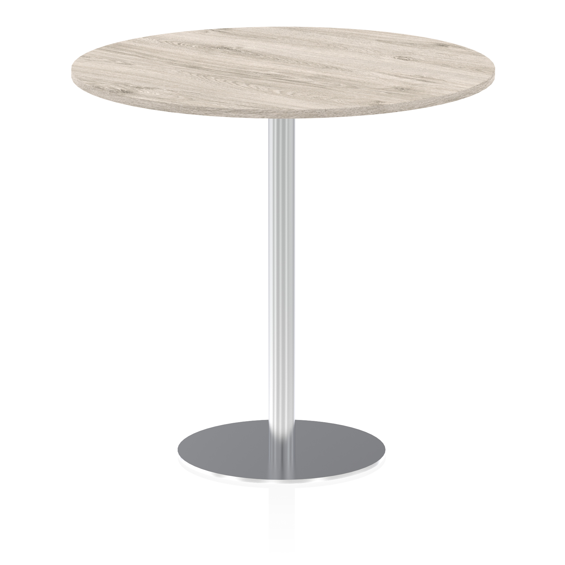 25mm thick desk top profile | Brushed stainless steel effect circular base (580mm diameter) | Brushed stainless steel pillars (76mm diameter) | Weighted base provides stability | Two part bolted frame system