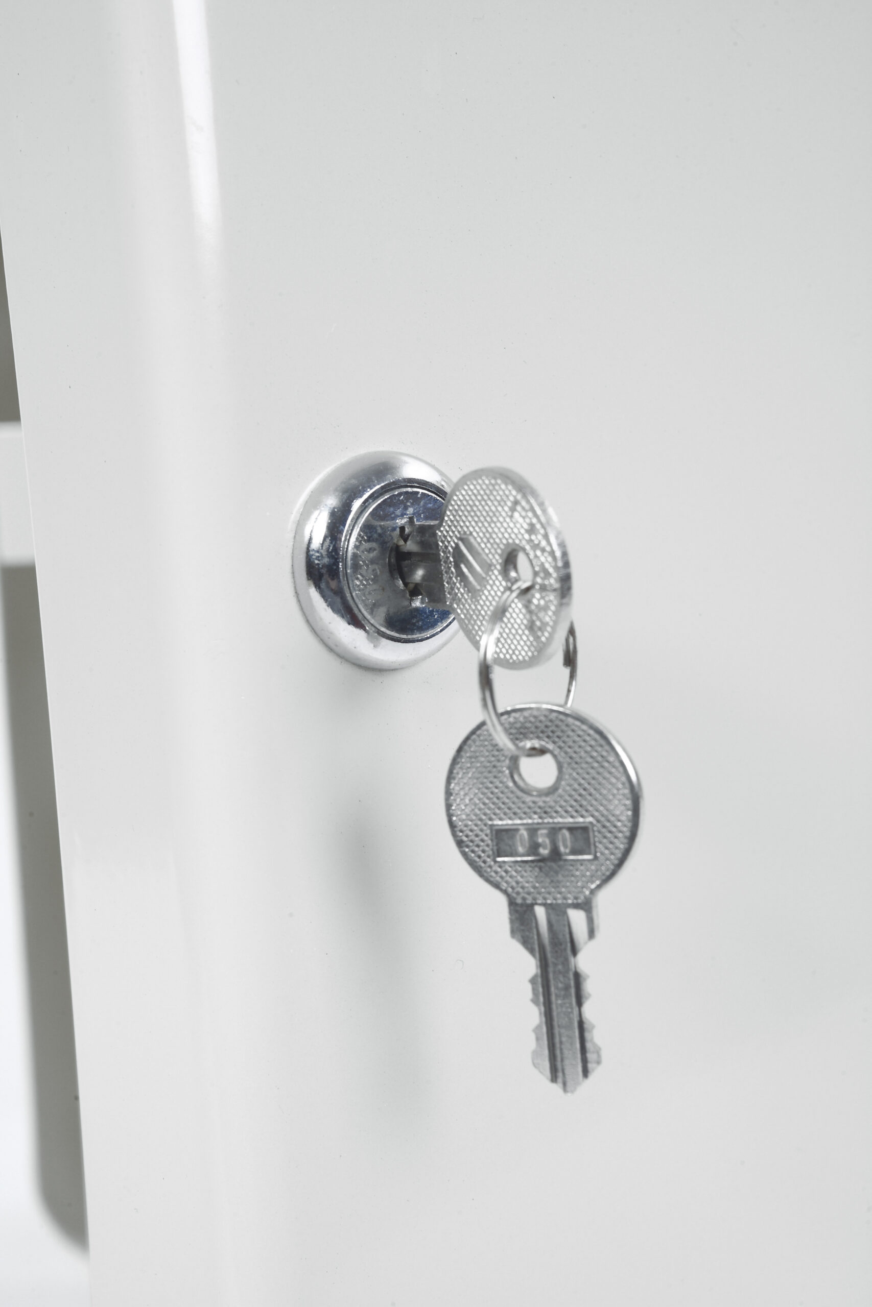 NO. OF KEY HOOKS – 20, 48 or 93 | LOCKING – Fitted with a high quality key lock supplied with two keys | FIXING – Ready prepared for fixing to the wall with fixings supplied | COLOUR – Finished in a high quality scratch resistant powder coat Grey paint.