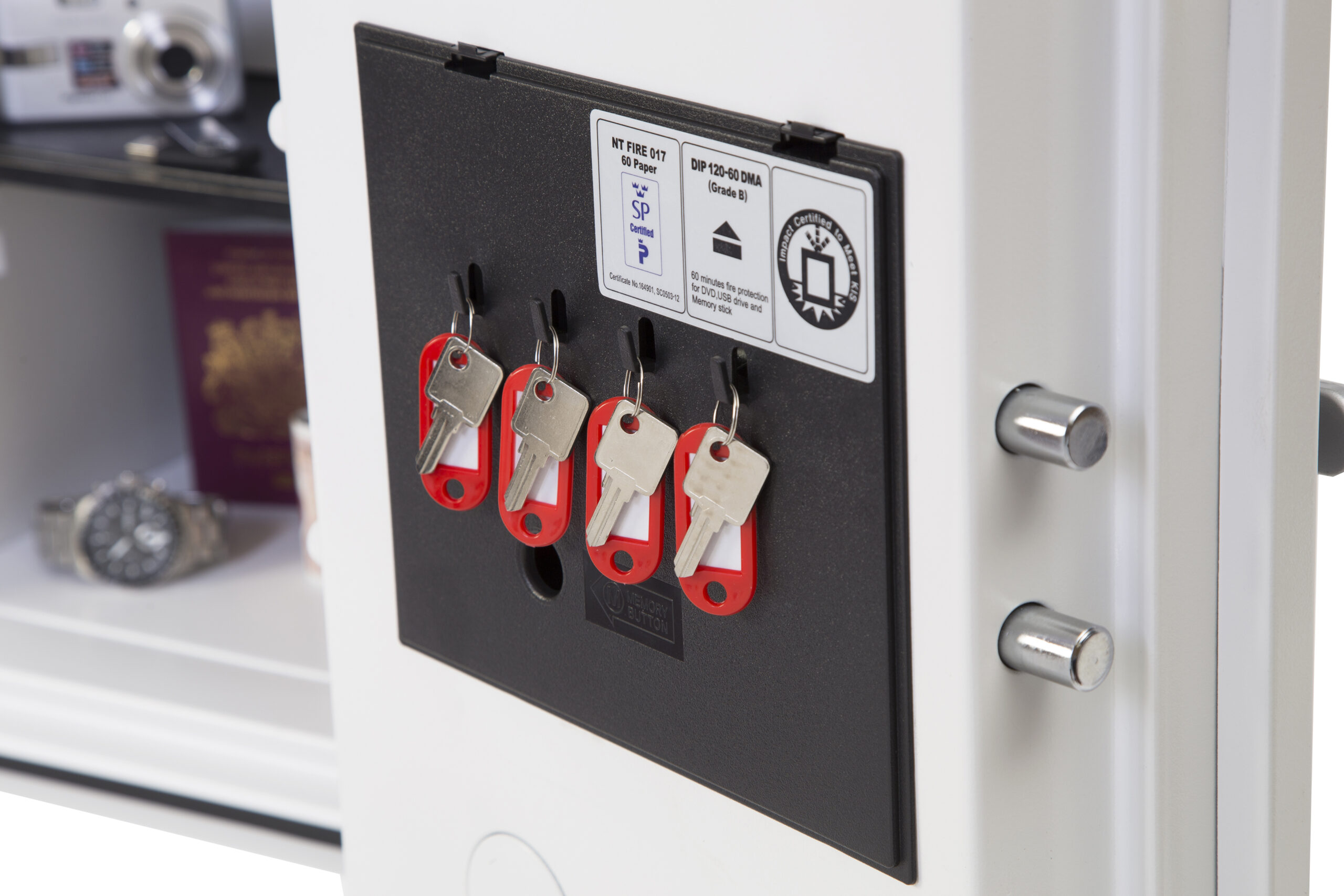 FIRE PROTECTION (PAPER) – Tested to the International NT Fire 017 – 60 fire test standard, at the Swedish SP Testing Centre providing 60 minutes fire protection for paper documents | FIRE PROTECTION (DIGITAL MEDIA) – Tested to MTC – DIP120 – 60DM fire test standard, providing 60 minutes fire protection for digital media, DVD’s, USB memory sticks & hard drives | SECURITY PROTECTION – The safe is recommended for an overnight cash risk of £2,000.00 or £20,000.00 valuables and is also ready prepared for floor fixing, with fixing bolts for concrete floors supplied | DROP TEST – Drop tested from 9.1 metres for resistance to the impact of falling through the burning floors of a building or the collapse of the building | SPECIAL FEATURES – Supplied with 4 internal key hooks, pull out drawer and (for Size 2 or 3) height adjustable shelf | COLOUR – Finished in a high quality scratch resistant paint RAL9003 White
